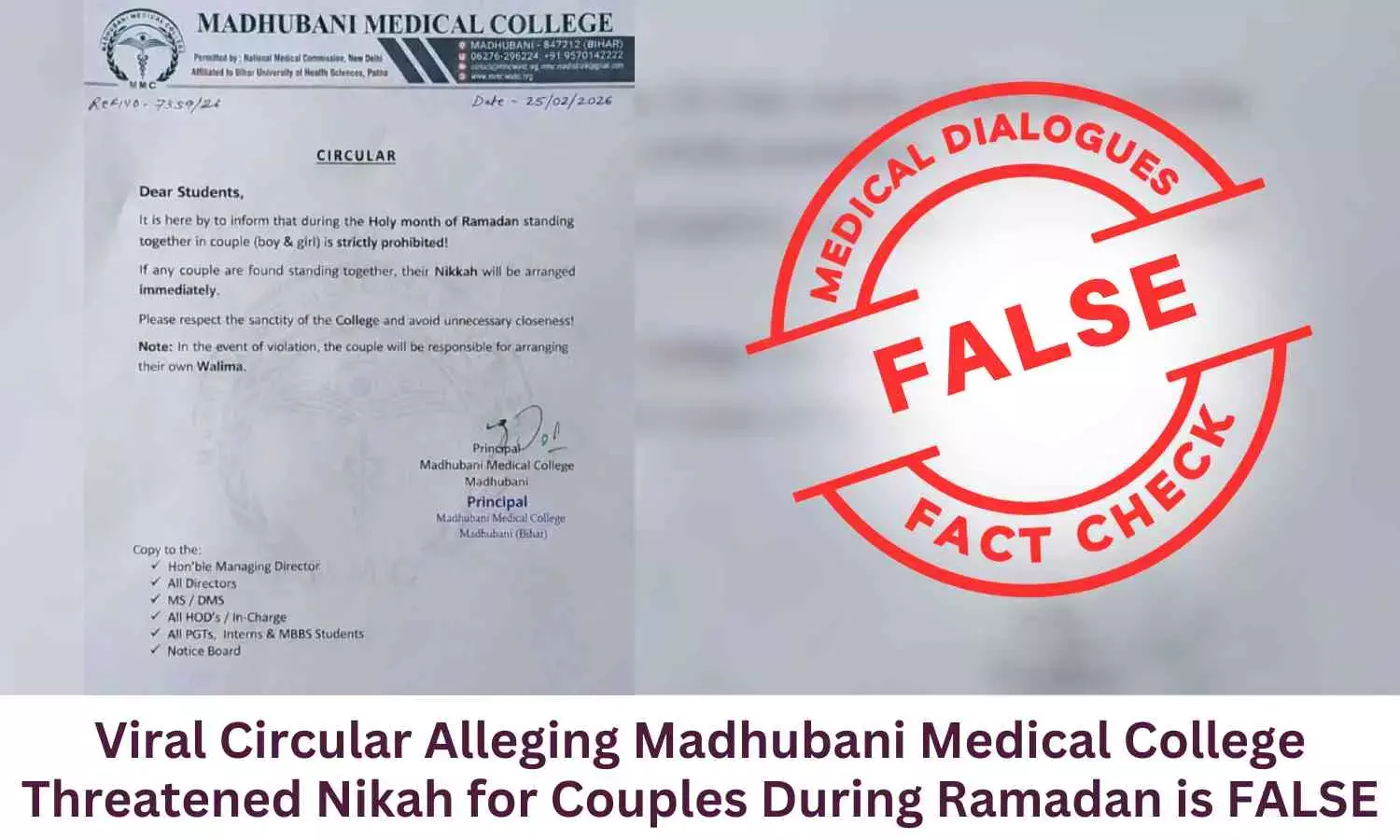 The circular circulating online, which alleges that Madhubani Medical College threatened to conduct “Nikah” for couples found together during Ramadan is FALSE. The institution has categorically refuted the claim through a statement shared on its official Facebook page dated 27 February 2026, clarifying that the document in question was not issued by the college.