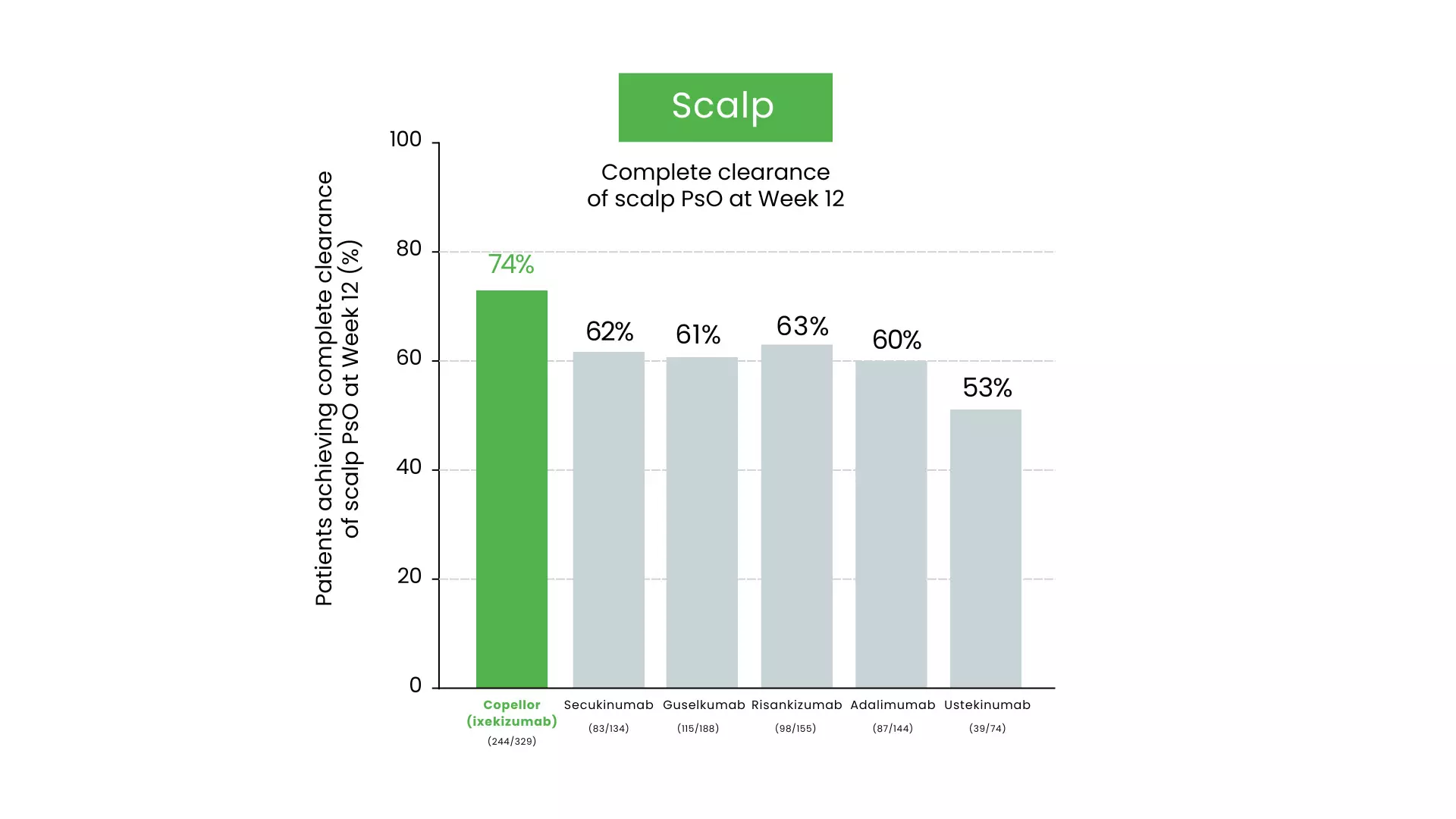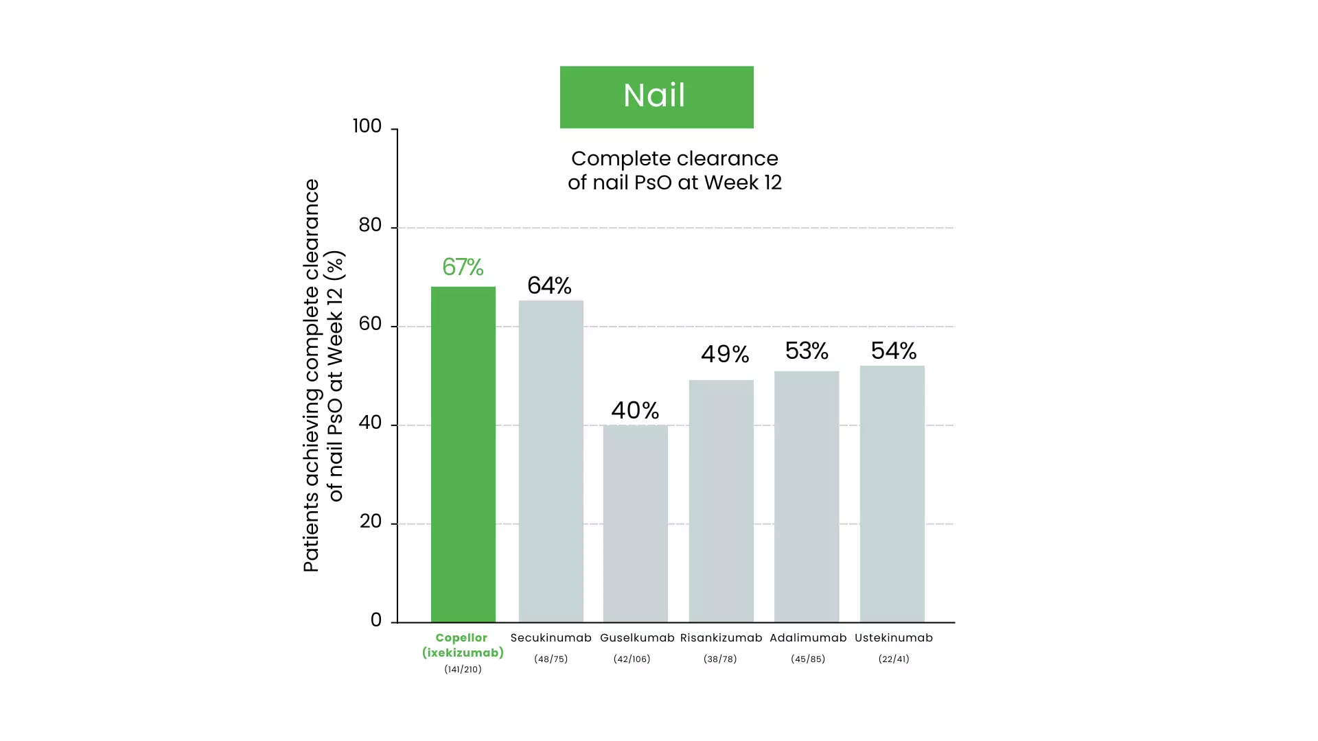 • Scalp and Nail Efficacy: Copellor (ixekizumab) shows superior results in difficult-to-treat areas, with roughly 70% of patients achieving clearance in both scalp and nails by Week 12 (figure 2 and 3). 10