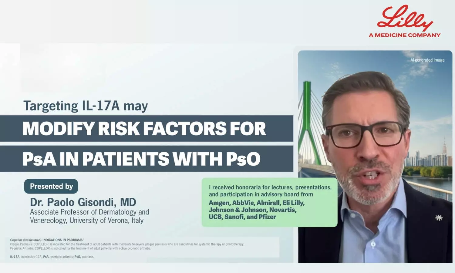 In this short video, Dr. Paolo Gisondi, MD, Associate Professor of Dermatology and Venereology at the University of Verona, Italy, discusses the increased risk of progression from psoriasis to psoriatic arthritis and highlights how treatment with Ixekizumab may modify these key risk factors.