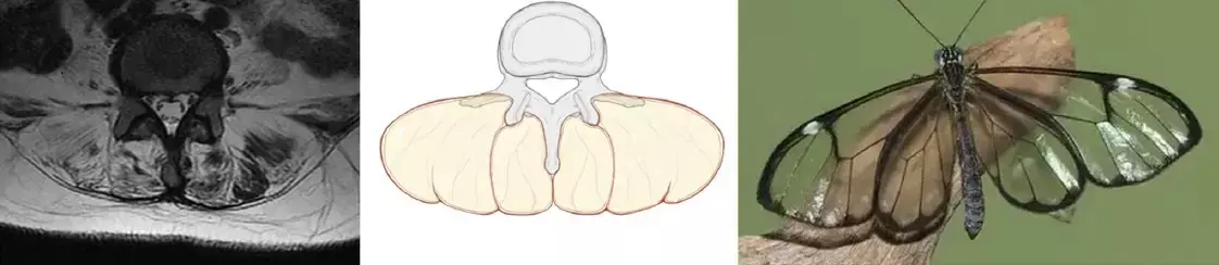 Muscle atrophy and fat infiltration result in extensive fat deposits in the posterior paraspinal muscles, which, when viewed on T2 axial MRI along with the vertebral body and spinous processes, produces a distinctive imaging appearance similar to that of a glassy-winged butterfly (Greta oto), which can be referred to as the “Greta oto” sign.